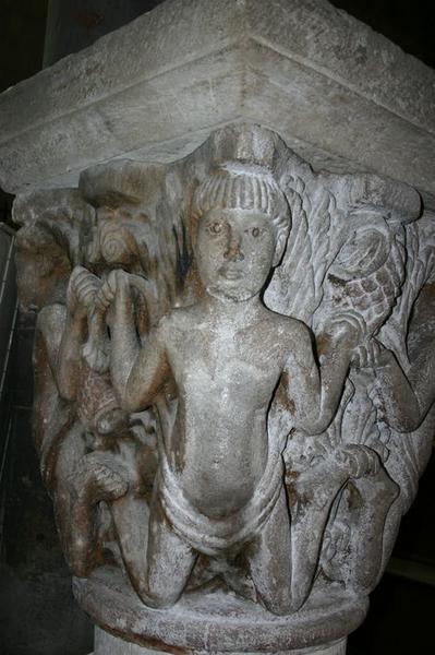 chapiteau : quatre personnages à genoux soutenant des grappes de raisin, vue générale