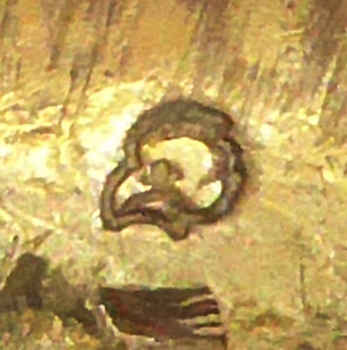 Calice, intérieur de la fausse-coupe : poinçon de décharge des menus ouvrages d'or et d'argent représentant une petite tête de poule (également présent sur le bord du pied) et traces de contrôle du titre de l'argent (également présentes sous la coupe).
