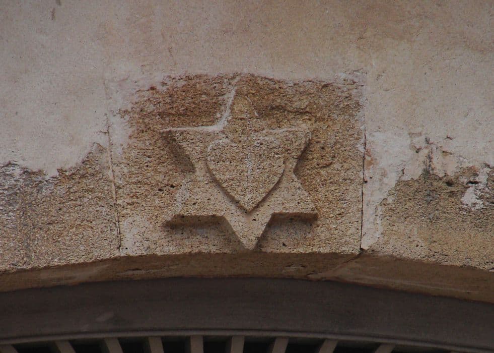 Église. Transept sud (élévation ouest) : cœur inscrit dans une étoile à 6 branches sculpté sur l’arc segmentaire de la porte.