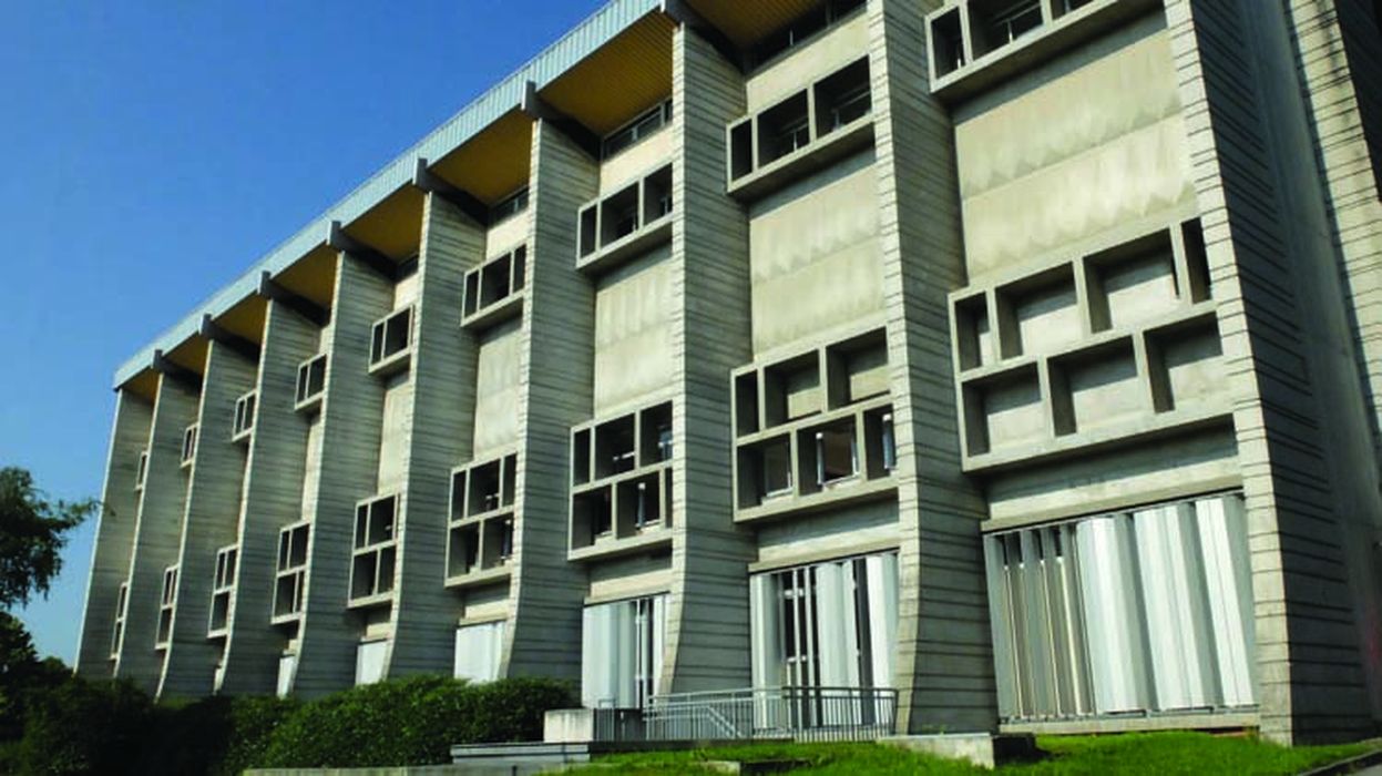 Le Palais des Sports de Dijon repose sur une conception fonctionnelle et polyvalente afin de lui assurer un statut d’équipement omnisports. L’édifice gravite autour d’une salle principale placée à rez-de-chaussée et équipée de gradins (3-4000 places) servant pour les manifestations sportives et les spectacles. Le plan carré est un parti pris des architectes afin d’intégrer tous les éléments du programme au sein de l’édifice depuis les locaux techniques et les salles d’entraînement en sous-sol jusqu’aux salles de réunion et au locaux administratifs dans les étages. Les façades sont caractérisées par une composition géométrique et sculpturale donnant un caractère monumental à l’ensemble. Laissées brutes de décoffrage, elles jouent sur les différents traitements du même matériau : piliers saillants traités en bossage*, cadres lisses soulignant les ouvertures et profils en pointes de diamant* en ornement. La Palais des Sports représente également une prouesse technique de par sa charpente incurvée en bois lamellé-collé*. Conçue selon une voûte incurvée, la charpente permet de franchir les 76 mètres de portée de la salle principale et compte parmi les plus grandes de l’époque avec un mode d’assemblage en chaînette.