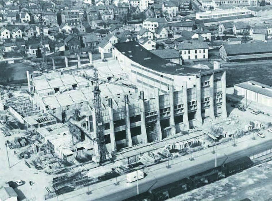 Le Palais des Sports de Dijon est situé dans le quartier Clémenceau, au nord-est du centre-ville et à mi-chemin avec la périphérie industrialisée créée dans les années 1950-1960. Le projet du Palais des Sports s’inscrit dans la dynamique de développement urbain d’après-guerre de la ville. L’édifice est implanté à proximité du Palais des Expositions réalisé par Roger-Martin Barade en 1956. Le site est retenu en raison de l’opportunité foncière pour la mairie (3 hectares disponibles) et de sa bonne desserte via les boulevards et la gare. Les premières études débutent à l’été 1971. La réalisation du projet est votée en 1974, marquant le début des travaux en plusieurs tranches. La partie nord de l’édifice est achevée en 1975, suivie de la pose de la charpente et de la couverture en juin 1976, puis de la partie sud (façade d’entrée) en décembre 1976. Projet aux enjeux politiques forts, le bâtiment bénéficie d’une cérémonie pour la pose de sa première pierre en décembre 1974 et d’une autre pour son inauguration.