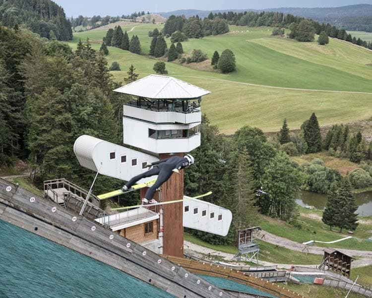 Affirmant clairement sa fonction, cet édifice offre un exemple original de tour de juge dédiée à la compétition du saut à ski. A l’instar d’autres constructions de ce type, comme celle du tremplin du Grépon à Chamonix, elle s’inscrit dans la tradition des tours d’observation. Sa silhouette d’arbre stylisé, l’utilisation du bois en façade, l’inclinaison des cabines reproduisant le dénivelé de la piste, assurent son insertion dans le site.