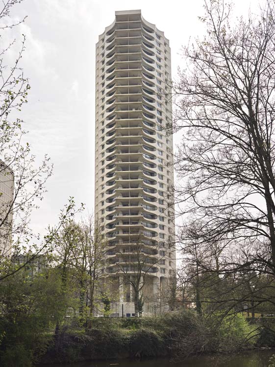 L'immeuble d'habitation Les Horizons est construit en 1970 par l'architecte Georges Maillols, chargé de la rénovation urbaine du faubourg de la rue de Brest, qui devient alors le nouveau quartier de Bourg-L'Evêque. L'édifice, de 100 m de haut, s'élève sur trente étages à partir d'un rez-de-chaussée fortement surélevé sur pilotis, en raison des risques d'inondation. Il est formé de deux tours accolées, à noyau ovale en béton, appuyées également sur une structure extérieure de quatorze poteaux en béton armé et des planchers en dalles pleines. Les techniques employées ont permis une construction rapide, au rythme d'un niveau par semaine. Les façades sont constituées d'éléments de 4,40 sur 2,30 m aux formes ondulées réalisés par le Société rennaise de préfabrication en ciment blanc et quartz concassé. Ces panneaux, adaptés à la taille des appartements et percés d'une embrasure ovoïde, donnent ainsi une silhouette alvéolée à l'édifice. Les tours des Horizons accueillent un millier d'habitants dans 480 appartements de type F2 prévus pour des jeunes couples ou des étudiants. Les appartements placés aux extrémités des tours et à la jonction de celles-ci disposent de balcons, également préfabriqués en ciment blanc. Les circulations verticales sont contenues dans les noyaux des édifices. L'architecte prévoit aussi 440 places de stationnement semi-enterrées dans un espace circulaire au pied du bâtiment. Les Horizons, devenus un des symboles de la ville, sont caractérisés par leur auteur comme un " témoin légitime de l'urbanisme contemporain.