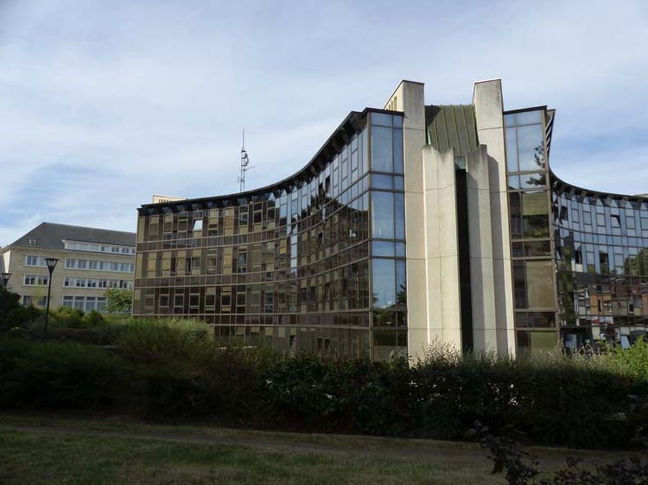 Le bâtiment abritant la préfecture est implanté légèrement en retrait par rapport à la rue du Général-Koenig, selon un plan en losange dont les pointes ont été tronquées. Situé dans un site sensible sur le plan patrimonial, il présente une hauteur modérée (trois étages au-dessus du rez-de-chaussée), notamment grâce au creusement du terrain permettant d'ajourer partiellement le sous-sol. Le stationnement est établi sur trois niveaux souterrains, la préfecture étant ainsi entièrement entourée par un jardin public facilitant les cheminements entre les différents bâtiments de la cité administrative. Quatre bassins circulaires, sorte de réminiscence des douves d’un château-fort, entourent les pignons du bâtiment, dont les épines de béton blanc contrastent avec le verre réfléchissant utilisé pour les murs-rideaux couvrant les quatre façades concaves du losange. L'étage sommital, réservé au cabinet du préfet, est percé d'un patio circulaire aménagé en jardin. Les espaces d'accueil du public sont traités avec un soin particulier : mosaïques de travertin, bancs en lamellé-collé, piliers en béton architectonique coiffés de corolles.