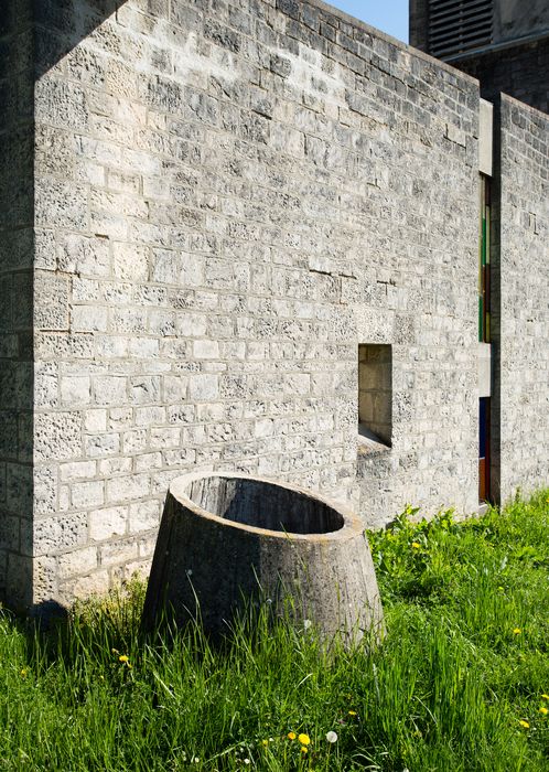En retrait, la façade est abritée par un auvent d’une verrière aux couleurs bleu, vert, jaune et blanc. Une partie pleine présente un décor de béton laissant croire à des blocs assemblés avec au centre une petite ouverture quadrangulaire de verre bleuté. Le clocher est à claire-voie horizontale. On entre dans un couloir rectangulaire, au sol de schiste vert qui s’ouvre sur de larges marches à un baptistère cylindrique. Puis, on pénètre dans la nef par une porte en chêne quadrangulaire massive. Deux grandes parois isolent le confessionnal de la nef. Sur le mur latéral nord, la chaire à prêcher est à remarquer par ses escaliers qui donnent une réelle sensation de légèreté. Elle se distingue admirablement de celle, antérieure, de Ronchamp par sa disposition le long du mur et non en angle, et par la présence à l’arrière de fines baies verticales qui y apportent une lumière, atténuée par des ressauts en béton disposés à l’extérieur. Sur la gauche de l’autel une verrière faite d’arêtes massives de béton laisse filtrer les couleurs en bande verticales : blanc, jaune et rouge. Ces lumières sont atténuées à l’extérieur par un mur perpendiculaire faisant brise-lumière. Ici, la lumière est partout mais rarement directe, toujours atténuée par un auvent, un ressaut, une paroi, elle se fait discrète pour tous les éléments du culte (baptistère, confessionnal, chaire à prêcher, autel) mais elle est suffisamment présente pour donner une belle luminosité au lieu. Les récupérateurs d’eau de pluie évoquent ceux de la chapelle Notre-Dame-du-Haut (1953-1955) sur la colline de Bourlémont à Ronchamp (Haute-Saône).