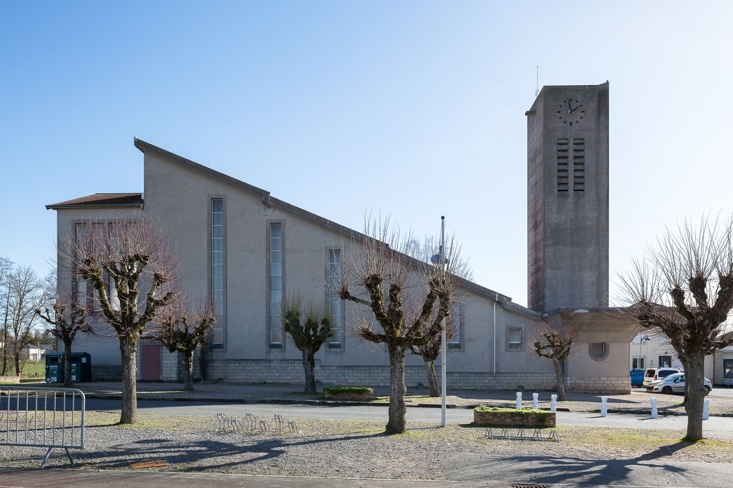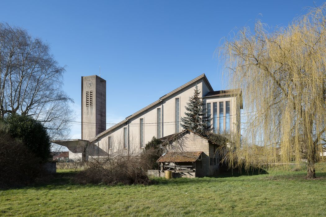 Pour l’église, il opte pour un plan rectangulaire. La salle de catéchisme et la sacristie sont contenues dans un bâtiment annexe accessible depuis le chœur. L’entrée de l’église est accentuée par un clocher situé dans l’axe du bâtiment dans lequel est encastrée une croix réalisée à partir d’éléments préfabriqués en béton. L’auvent marque le départ de l’inclinaison progressive de la toiture vers le chœur. À l’intérieur, l’augmentation progressive de la hauteur sous plafond évoque le cheminement du fidèle vers le sacré et participe à la mise en valeur du sanctuaire. La nef est séparée du chœur par un portique en béton, véritable “arc triomphal”, qui s’élève à 11,5 mètres. Depuis l’entrée, des voiles en béton successifs dirigés vers l’autel dissimulent les ouvertures et dirigent toute la lumière vers l’espace sacré. L’intérieur est ainsi différencié par des intensités lumineuses contrastées. Les peintures sur les voiles en béton ont été réalisées par l’artiste Pierre Jacquot. Le chemin de croix est l’œuvre de Jacqueline Bourgon, fille de l’architecte, et de Françoise Champion.