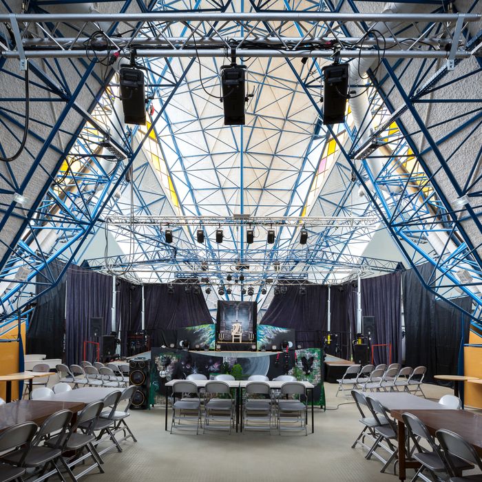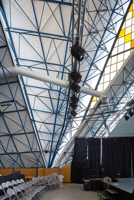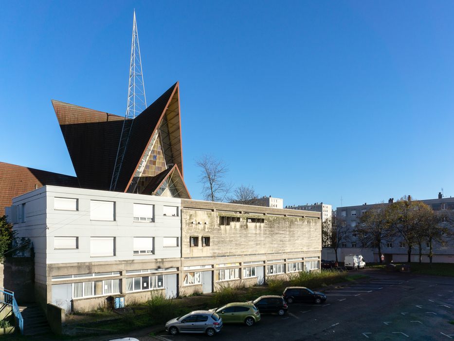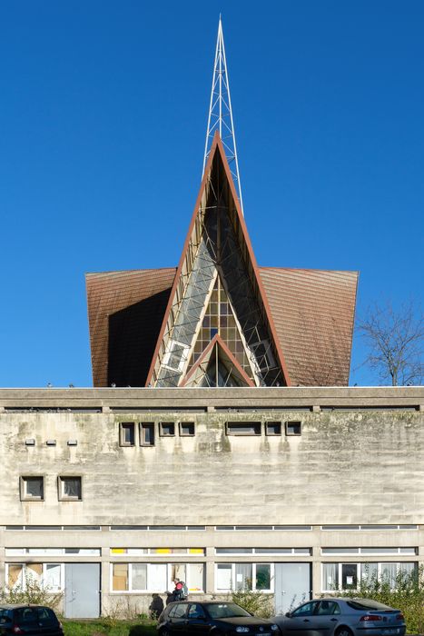 En plan, la composition se développe à partir d’un triangle équilatéral correspondant au chœur et évoquant la Sainte-Trinité. Les annexes paroissiales sont contenues dans un bâtiment oblong à deux niveaux. Le volume central de l’église est couvert d’une charpente métallique composée de six pans triangulaires montés en “parapluie”. La forme expressive de la toiture permet d’identifier facilement le lieu de culte au sein du quartier marqué par l’orthogonalité de ses constructions. Un projet de reconversion confié aux architectes du Groupe Acanthe est lancé en 1999 pour transformer l’église désaffectée en centre culturel. Réceptionnés en 2001, les travaux ont permis d’aménager l’espace intérieur de l’église en salle de spectacle tout en conservant les qualités du bâtiment d’origine : l’unité du volume intérieur, la visibilité de la charpente et la composition des façades.