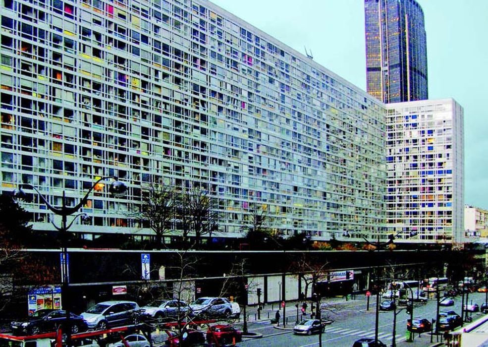 L’immeuble conçu par Jean Dubuisson s’inscrit dans l’opération Maine-Montparnasse, un des grands projets de rénovation urbaine à Paris initiés par l’État, déjà à l’œuvre sur le quartier de La Défense. Première opération réalisée sur la rive gauche, elle sera suivie de l’aménagement du Front-de-Seine et du secteur Italie. Jean Dubuisson met au service de cette entreprise son expertise dans le logement de haute densité, associé à la préfabrication et à d’importantes contraintes budgétaires. Cet admirateur de Mies van der Rohe et d’Arne Jacobsen applique en les mettant en synergie son intérêt pour les procédés constructifs innovants, les modes d’habiter et une esthétique à la rigueur minimaliste et savante. L’architecte propose une nouvelle variation de la trame écossaise qui fait sa signature et montre à nouveau sa capacité à diversifi er et à optimiser l’organisation des logements à partir d’éléments standardisés. Cet immeuble d’une taille exceptionnelle au cœur du tissu parisien voit le jour dans un contexte d’émergence de la pensée critique sur la ville. Les habitants développeront très rapidement un fort sentiment d’appartenance au « village Mouchotte » et un esprit communautaire qui entraîna leur participation active à l’évolution de l’opération Maine-Montparnasse.