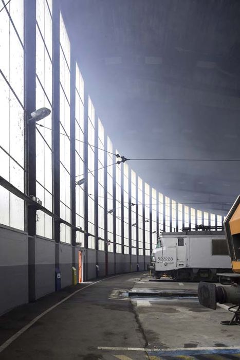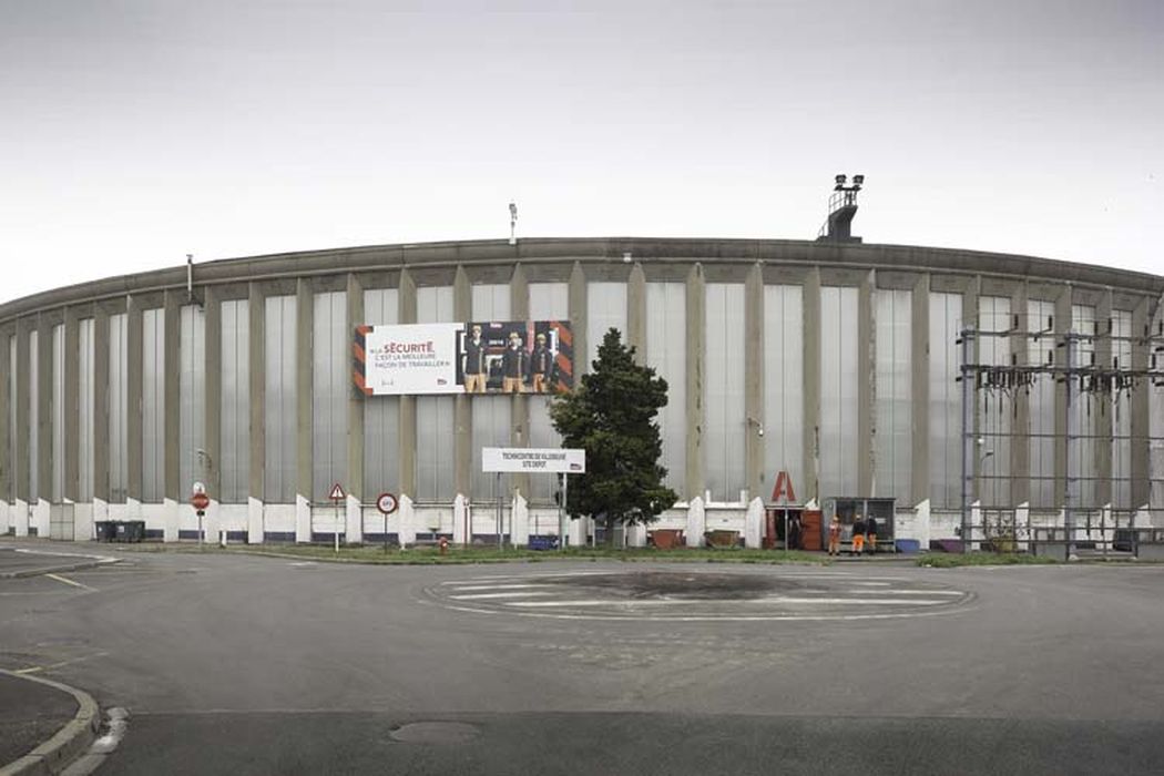 La rotonde est implantée sur le site de la gare de triage de Villeneuve-Saint-Georges, à proximité d’un important embranchement d’où une voie s’échappe pour mener les locomotives jusqu’au bâtiment. Celui-ci présente un plan annulaire, interrompu dans son quart nord-ouest par 13 voies non abritées. Les parties couvertes abritent 32 stalles où sont entreposées les locomotives conduites à cet emplacement après avoir transité par un pont tournant de 27 m. situé au centre de la rotonde, en plein-air. Une rotonde ferroviaire apparaît ainsi comme une véritable écurie dédiée à ce mode de transport. Permettant par sa forme de réduire l’emprise au sol par rapport à un bâtiment rectangulaire, la rotonde réunit plusieurs caractéristiques du type P, qui se défini principalement par ses dimensions : 133 m. de diamètre, 15 m. de hauteur de façade extérieure, 8 m. de hauteur pour la façade intérieure. L’ensemble est construit en béton armé, la couverture en voile mince de seulement 7 cm. d’épaisseur étant portée par trois séries concentriques de poteaux, dont seuls ceux distribués sur les deux cercles intérieurs sont coulés en élévation. Les poteaux dits « V Laffaille » sont placés le long de la façade extérieure : ces imposantes structures à section en V, très résistantes, ont été fabriquées et démoulées à terre, puis dressées à leur emplacement par des engins de levage, selon les principes de préfabrication et de rationalisation du chantier caractéristiques de la démarche de Bernard Laffaille. La préoccupation de l’ingénieur s’inscrit en effet dans un souci d’économie en réduisant la main d’œuvre ordinairement nécessaire pour un coffrage traditionnel, le temps de travail, à la fois sur le chantier et dans la phase de conception par l’élaboration de plans types, et le coût des matériaux. Les 32 modules abritant les locomotives à vapeur sont répartis dans les quartiers couverts de la rotonde. Chacun contient une fosse d’entretien de 25 m. de long et une hotte aspirante en métal, fournie par les Etablissements Viennot, suspendue à des haubans accrochés aux tirants de la voûte à l’aide de colliers métalliques, afin d’évacuer les fumées des locomotives. La hauteur sous plafond près des poteaux extérieurs permet d’accentuer l’aération, les vapeurs subsistantes étant en outre extraites par des ouvertures disposées dans l’intrados des voutes et communiquant avec l’extérieur, au niveau de la couverture, par l’intermédiaire d’une gaine et d’un déflecteur. Cette hauteur importante, liée à l’utilisation d’une large surface de châssis vitrés sur la façade extérieure, permet d’accentuer la luminosité naturelle dans les stalles.