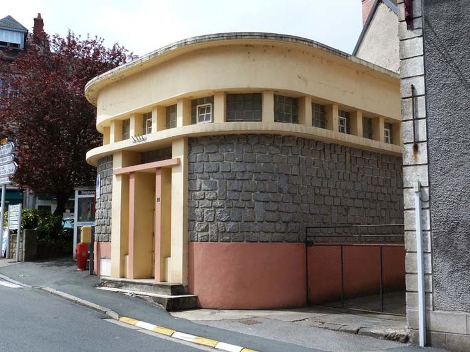 Le bâtiment présente un plan quadrangulaire dégagé sur trois côtés, seul celui orienté au nord s'appuyant sur un bâtiment mitoyen. Très simple, la disposition intérieure comprenait une laverie et une salle d'attente équipée d'un guichet donnant accès à l'espace destiné aux ablutions : sept cabines de douches et deux bains étaient proposés au public. La chaufferie, destinée tant à l'eau qu'à l'air ambiant, était installée au sous-sol. Quoique modeste par ses dimensions, le bâtiment jouit d'un aspect soigné, rendu nécessaire par sa position en cœur de village. L'architecte clermontois Louis Galland en dresse les plans qui correspondent au style des années 1950, notamment par l'emploi de façades courbes et d'un toit-terrasse qui distinguent les bains-douches dans un environnement de constructions plus anciennes. Les élévations mêlent différents coloris et matériaux : le soubassement en béton est recouvert d'un mortier de ciment rouge, et surmonté de moellons de granit taillés et équarris, caractéristiques du pays. Une corniche imposante coiffe l'édifice : son bandeau intègre des baies closes par des pavés de verre dont le module est identique à celui de l'appareil de granit des façades. Le même matériau – alors synonyme de modernité et de propreté – encadre la porte d'entrée munie d'une grille en fer forgé.