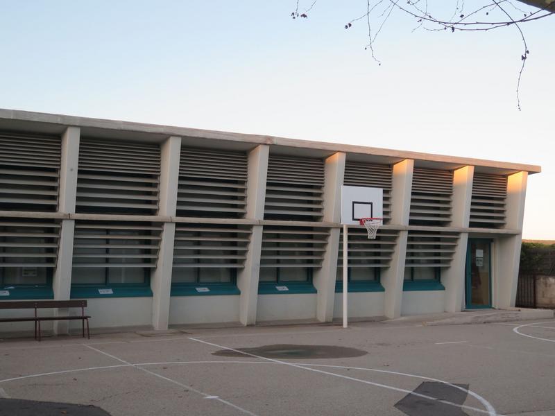 En 1949, un budget de 20 millions de francs est attribué à une expérience d'écoles prototypes. Afin de réduire les délais de construction et le coût des dépenses, les architectes doivent proposer l'utilisation d'éléments préfabriqués. La municipalité prend des informations à ce sujet et se voit retenue par la Commission interministérielle des prototypes scolaires (courrier du 14 décembre 1949). Henri Mathé, architecte parisien auteur d'un premier projet, avec une entreprise de la Somme, est contraint à renoncer. Contacté en janvier 1950 pour donner son avis sur le projet de Mathé, Claude-Charles Mazet (1908-1982) "architecte-reconstructeur" à Béziers, a proposé son propre projet directement au maire, en arguant que ce n'est pas une école provisoire et que le procédé qu'il décrit a déjà été testé lors de "la construction des bureaux et laboratoires de la Société Micron-Couleurs à Balaruc-les-Bains. Ils ont été terminés en 42 jours". Mazet entame les démarches pour faire agréer au niveau national son projet, qu'il publie dans le n°29 d'avril 1950 de la revue "L'architecture d'Aujourd'hui". Les travaux commencés officiellement le 7 août sont terminés le 30 septembre, après "44 jours de travail au lieu des 45 prévus". La rentrée se fait le 2 octobre 1950. Le coût de la construction a été de 7 723 000 francs. Ce projet a suscité beaucoup d'intérêt et connu un grand retentissement, en raison des publications nationales sur le sujet : pour la revue "Rapports France-Etats-Unis" de janvier 1951, un reportage réalisé par l'agence photographique Rapho.... Claude Mazet signale en octobre 1950 la visite d'une "caravane composée des inspecteurs et des instituteurs et institutrices de l'Hérault ", lui-même est interviewé lors d'un "reportage par Frédéric Pottecher émis sur Paris vous parle". Mazet a construit sur ce type "Delta-Mazet" les écoles de Sète, Balaruc, Alignan-du-Vent dans l'Hérault, la Baume à Marseille. Il a utilisé son "procédé Delta-Mazet" pour d'autre types d'architecture, pour la construction d'un certain nombre de cliniques dans la région, des villas ou des lotissements à Béziers (pour sa propre villa et pour un immeuble de la Cité Verte), ainsi qu'à Toulouse, Pessac, Narbonne, Perpignan. Orientée nord-sud, l'école a un plan rectangulaire, avec toit à une pente et écoulement des eaux par un poteau extérieur. Elle comprenait une classe de 60 m2, un atelier réfectoire de 38 m2 ouvert sur le couloir et la salle de classe, une galerie vestiaire de 20m2, un préau de 60 m2, les privés filles, les privés garçons, une chaufferie et l'habitation de l'instituteur, équipé en appareils sanitaires et d'entretien, plus un garage-bûcher-buanderie. Sa construction est standardisée et préfabriquée : sur un radier général armé, les parois extérieures et intérieures de l'école sont en aggloméré de pouzzolane, se terminant en partie haute par un chaînage en béton armé. La dalle de couverture est constituée d'éléments prémoulés en pouzzolane et ciment armé, coulés sur panneaux isolants. La façade est constituée d'éléments en béton de ciment prémoulés en usine et montés en même temps que le gros-œuvre. Les brise-soleil assurent le dosage de l'ensoleillement. Côté rue, le bâtiment est percé des fenestrons des toilettes et de la chaufferie et des trois fenêtres hautes du couloir. Côté cour, le bâtiment comprend le préau à gauche, qui sert d'entrée et les deux salles sur la droite. La façade est unifiée par le système de huit baies doubles, sur deux niveaux, encadrées de pare-soleil verticaux et horizontaux prémoulés. Un soubassement en béton court le long des baies vitrées. Les classes reçoivent un maximum de luminosité ; elles sont également éclairées sur le couloir, par trois grandes baies. La ventilation est assuré par l'ouverture basculante de la partie supérieure de la fenêtre haute. La fenêtre inférieure est oblique, à soufflet et pendulaire, en position de fermeture, elle forme un angle de 35° avec le châssis. Les ouvertures à soufflet et les fenêtres "Delta" sont en profilés métalliques avec parcloses de chêne. Selon l'architecte "le plafond du préau, peint en bleu, est un morceau de ciel tenu en réserve pour les jours gris". Les aspects pratiques ont été bien étudiés : soubassements revêtus de linoléum, sols en matière plastique, chauffage central, vanne d'incendie, grand lavabo dans le couloir. Dans toutes ses écoles, l'architecte a prévu un décor, ici à l'entrée du préau, une grande peinture représentant les travaux de la vigne. Dans le couloir appelé "galerie-vestiaire", les "porte-manteaux réceptacles" sont constitués d'une boîte métallique permettant d'entreposer son goûter. L'école de Claude Mazet remplit parfaitement les critères de préfabrication et de rapidité d'exécution, coût maîtrisé, normes d'espace et d'éclairage, mais se singularise par une attention portée aux détails, pour le confort des enfants. Dans les années 1990, le logement de l'instituteur, de 75 m2, qui se trouvait de l'autre côté de la cour et disposé perpendiculairement, a été démoli pour construire une crèche sur son emplacement. L'école a été agrandie à l'arrière et le système de fenêtres pendulaires transformé : des fenêtres coulissantes en aluminium ont été posées et des pare-soleil horizontaux en aluminium installés dans la partie haute des baies.