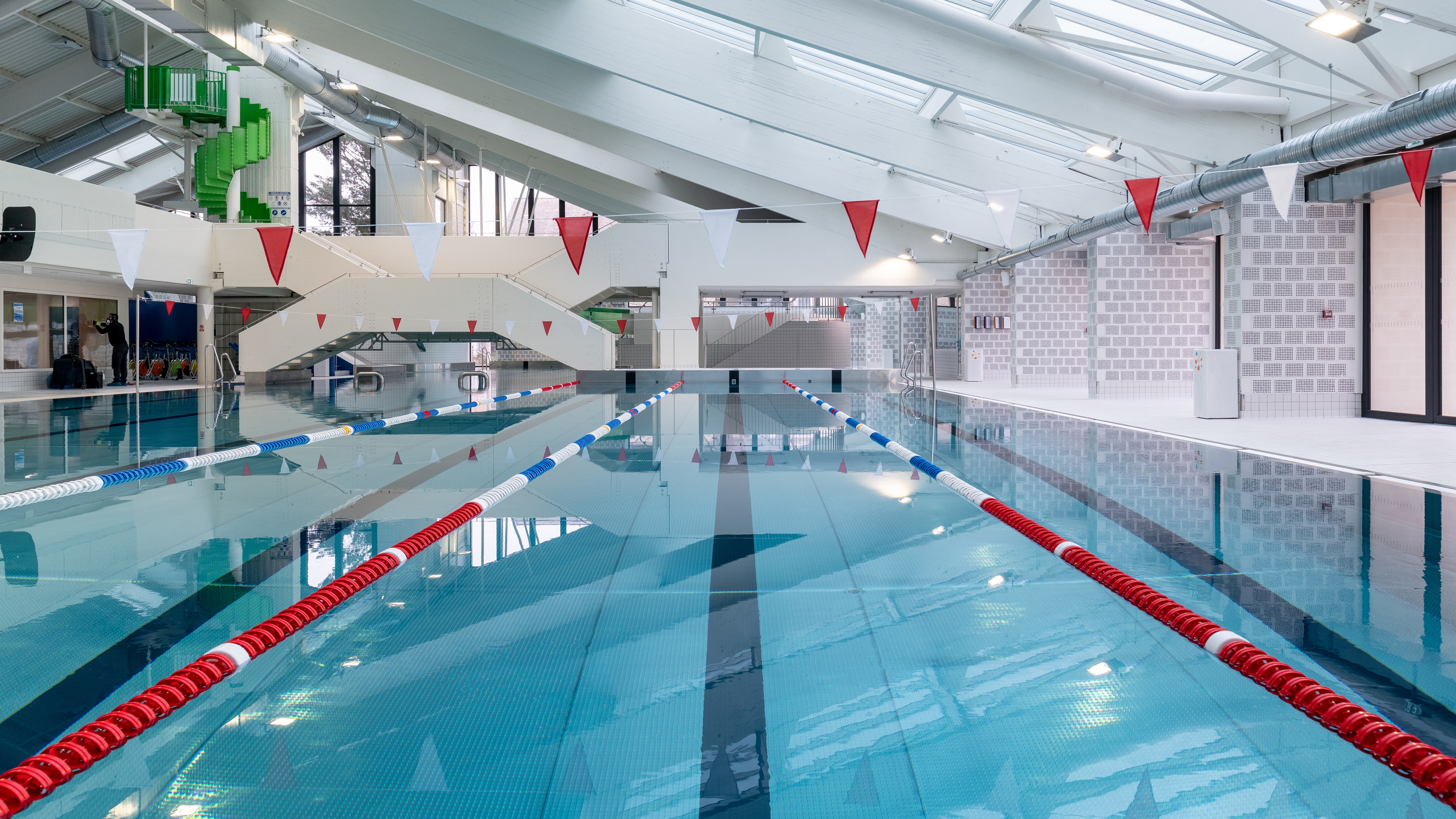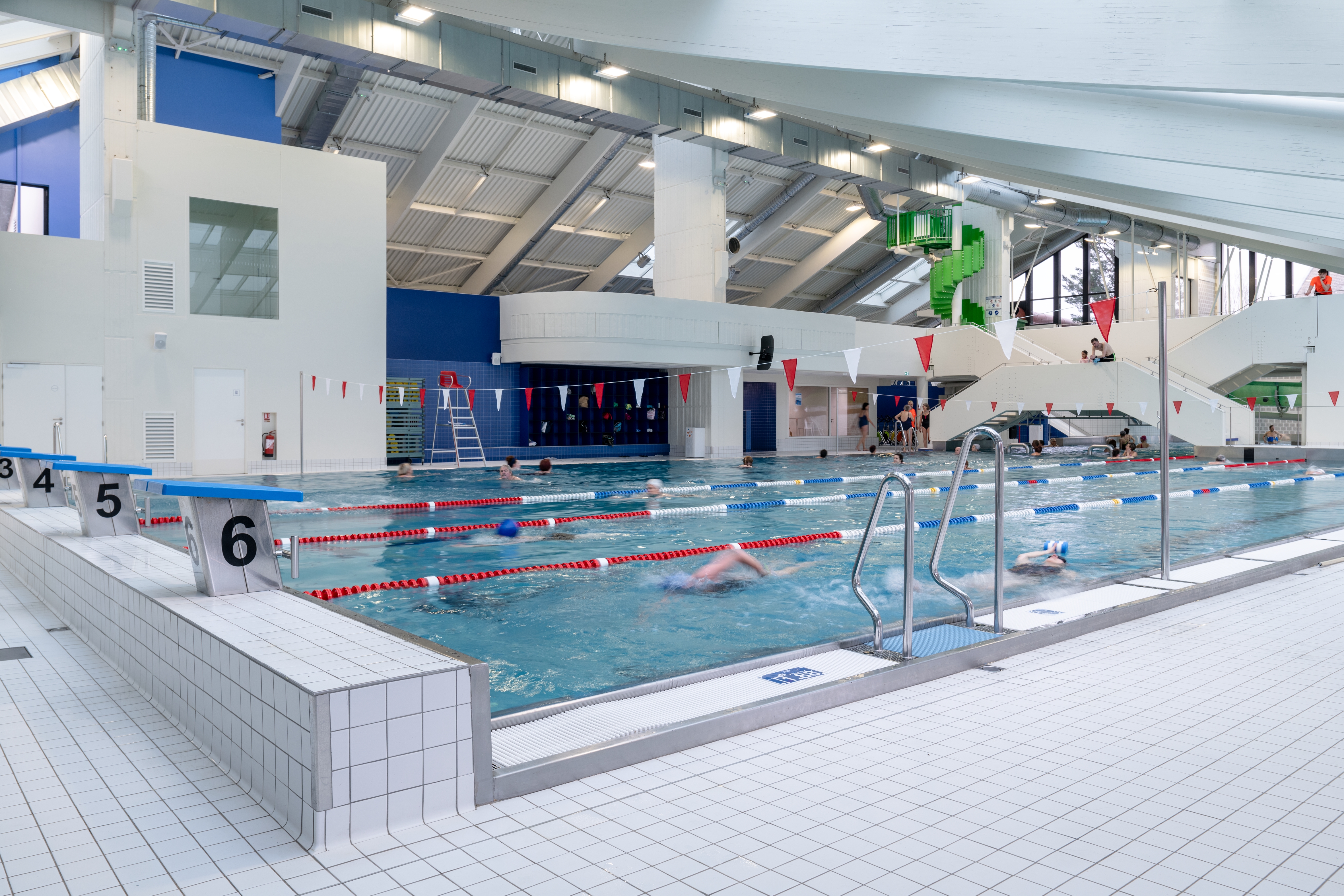 Le parti-pris de peindre la charpente et d’utiliser des revêtements intérieurs uniquement blancs vise à rendre plus lisibles les différents espaces de la piscine tout en soulignant la structure originelle du bâtiment. Cette couleur révèle également les nombreuses qualités de l’existant, comme le détail du dessin des baies (mur-rideau travaillé, baies carrées ponctuelles) ou la finesse de la structure métallique permettant de suspendre le grand toboggan de 63 m de long. La nouvelle passerelle surplombant les deux grands bassins est travaillée comme un ponton aux formes simples. La rénovation a également permis de requalifier les espaces extérieurs en ajoutant une rivière extérieure installée dans la pente du terrain.
