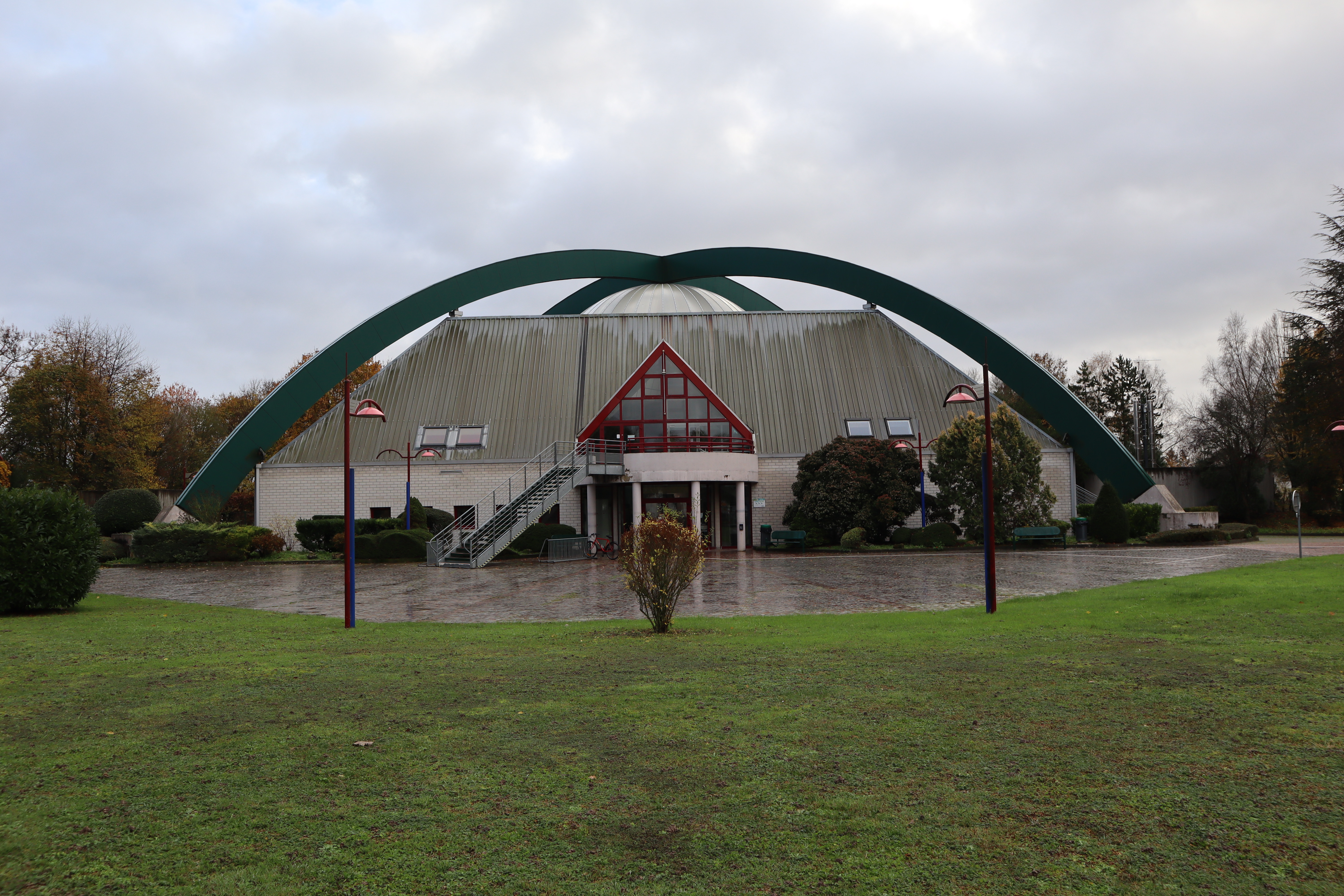 Implantée le long d’un axe structurant, à la lisière sud de Suippes, la piscine est conçue comme un appel visuel destiné à requalifier l’entrée sud de la commune. Elle s’insère comme un objet autonome au centre d’un parc verdoyant et planté aménagé en 1994 sur les plans du paysagiste Christian Prieux. “D’une architecture résolument moderne, alliant bois et vitrage, l’ouvrage se veut un signal à l’entrée de la ville, une sorte de réponse au silo qu’il jouxtera.” L’équipement possède une volumétrie compacte et expressive déterminée par les choix structurels audacieux de Robert de Busni. Deux arcs extérieurs massifs en lamellé-collé d’une hauteur de 17,39 m émergent du parc et soutiennent l’ensemble de la couverture. Le volume de la piscine s' inscrit dans un plan carré parfait de 36 m de côté, les arcs et leurs culées massives en béton s’implantent le long des diagonales de ce carré. Au centre des diagonales, le volume de la piscine est coiffé d’un dôme soulignant la composition géométrique rigoureuse de l’édifice. Les élévations résument le parti-pris architectural de l’architecte : aucun élément ne vient perturber la lecture des arcs en lamellé-collé. La couverture suspendue en bac acier forme plus des deux tiers des élévations et vient s’asseoir sur une maçonnerie continue d’agglos. Deux petits volumes en saillie ponctuent cette rigueur. Au nord, l’entrée principale de l’édifice est marquée par un balcon central hémicylindrique abritant, au rez-de-chaussée le SAS d’entrée desservant le hall d’accueil, et permettant d’accéder à l’étage à la grande salle de réunion devenue salle de sport. L’entrée monumentale est également soulignée par une verrière à deux pans soulignant l’axe de symétrie de la composition. Au sud, avant-corps central pyramidal entièrement constitué de verrières abrite l’espace solarium et pataugeoire. A l’intérieur, le plan témoigne d’une grande rationalité : les espaces techniques sont regroupés au nord sur deux niveaux pour que l’espace dédié aux bassins en double hauteur s’ouvre au sud sur le parc visible depuis de larges baies vitrées. Un axe de symétrie nord-sud permet ensuite d’organiser le plan. Au rez-de-chaussée, les locaux du personnel s’inscrivent au centre le long de cet axe et sont flanqués à l’est par les vestiaires hommes et à l’est par les vestiaires femmes. En périphérie s’implantent les bureaux et les locaux techniques (rangement, infirmerie, traitement d’eau, locaux chauffage) également accessibles depuis l’extérieur. L’étage quant à lui regroupe un logement de fonction (dont la réaffectation est en cours d’étude), une salle de sport avec vestiaires, une salle anniversaire, un espace hammam, et sous le dôme les gradins qui permettent d’admirer le bassin principal de 25 x 12,5 m. L’espace abritant les trois bassins (grand bassin, pataugeoire et toboggan) permet d’appréhender les qualités structurelles de l’édifice. L’ensemble de la charpente suspendue aux arcs extérieurs en lamellé collé est visible. Elle est réalisée en pin sylvestre et conserve ses couleurs d’origine et permet de lire la reprise des forces depuis le dôme central jusqu’au arbalétriers intérieurs longeant les façades. D’une grande légèreté, elle s’oppose au massif maçonné de briques silico abritant au nord l’ensemble des espaces techniques. La charpente suspendue permet également de travailler des façades non porteuses en murs-rideaux ouverts et vitrés. Ainsi, la lumière inonde l’espace des bassins grâce au dôme central en polycarbonate et aux châssis aluminium continus. Depuis la création de l’édifice, plusieurs phases de rénovation ont eu lieu. Plusieurs audits énergétiques ont également été réalisés et traduisent la volonté de la Communauté de Communes à s’engager fortement dans la nécessaire transition énergétique de son patrimoine en intégrant des énergies renouvelables.