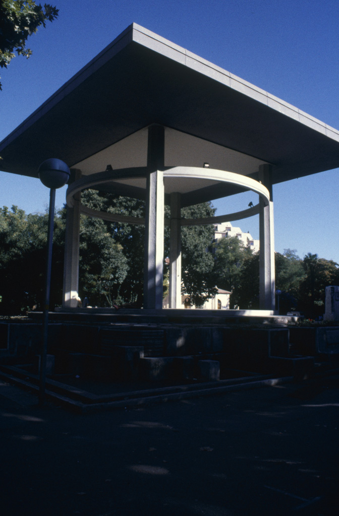 Kiosque à musique, entièrement en béton armé. Sur un podium, quatre colonnes cannelées supportent une couverture en terrasse horizontale. Une poutre circulaire, raidit l'ensemble, aux trois quart des colonnes. Cet anneau servait aussi de support à un rideau amovible fermant l'arrière de la scène. Sur les faces du podium s'adossaient des escaliers donnant accès à la scène ou aux locaux techniques se trouvant sous le podium, des jardinières et une fontaine ayant un décor céramique, des dauphins en céramique bleue crachant de l'eau qui, d'après Georges Dezeuze, auraient été commandées à Josep Llorens Artigas (1892-1980).