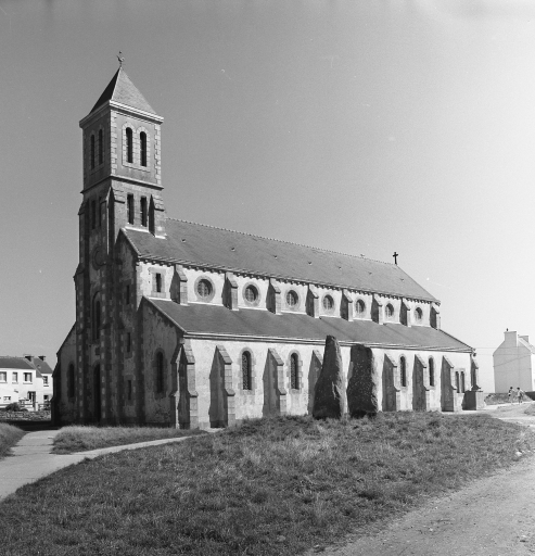Eglise Saint-Collodan et Saint-Guénolé construite entre 1898 et 1901 sur les plans de Gassis ; inscription sur plaque granite porte ouest : STAT VIRTUTE DEL ET SUDORE PLEBIS 1901.