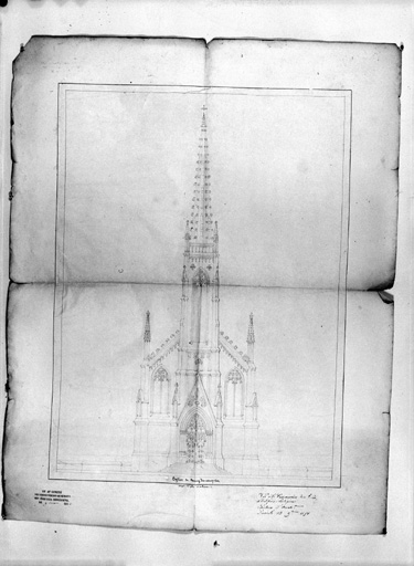 flèche en maçonnerie ; toit à longs pans ; noue ; pignon découvert