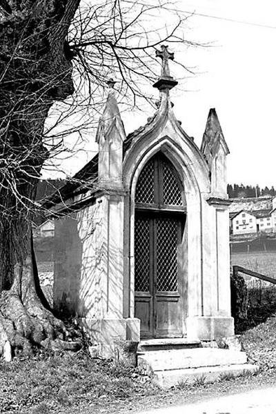 A remplacé une chapelle édifiée en 1739 ; construction en 1889 ; monogramme IHS ; emblème professionnel (marteau, pinces, équerre, truelle, compas) ; inscription G.B.M. 1739