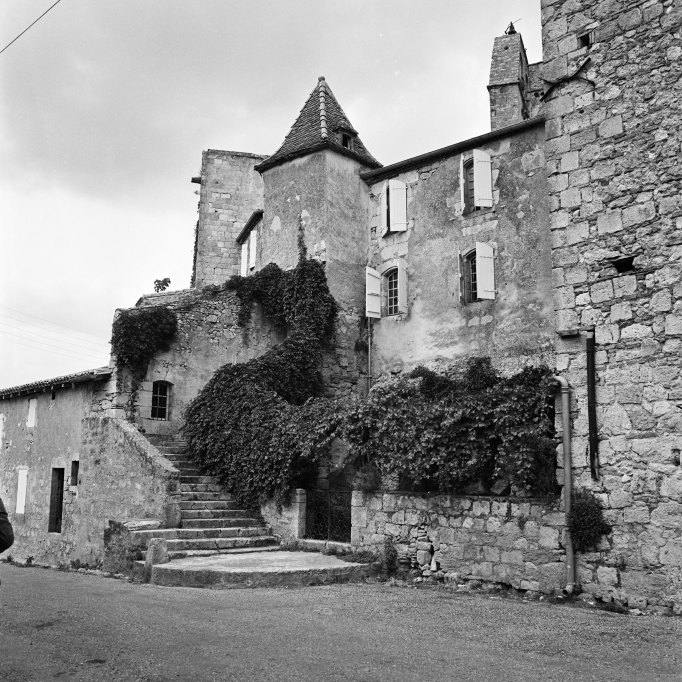 Signalé en 1306 comme ancien château des vicomtes de Lomagne ; tour carrée et bâtiment est (avec archère cruciforme) du 13e ou du 14e siècle ; croisées (vestiges) du 15e siècle ; logis remanié surtout au 19e siècle