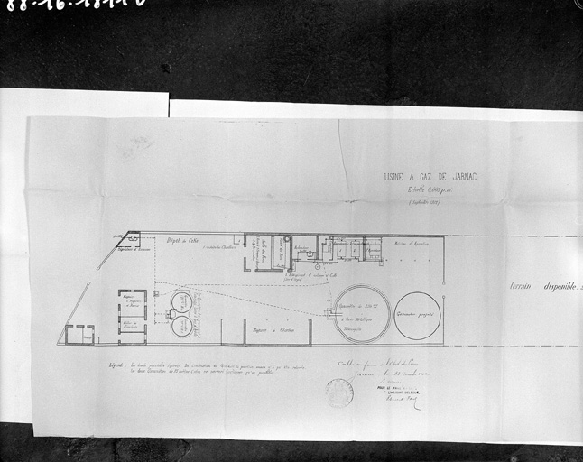 Projet d'usine à gaz en 1880 par L. Ebrard, agent cantonal, et Bernard, ingénieur de la Compagnie des Gaz, et traité pour l'éclairage avec Auguste et Pierre _Emille Gapiaud, ingénieurs civils d'usine à gaz, demeurant à Paris, 2 rue Drouot. Très remaniée dans la 2e moitié du 20e siècle