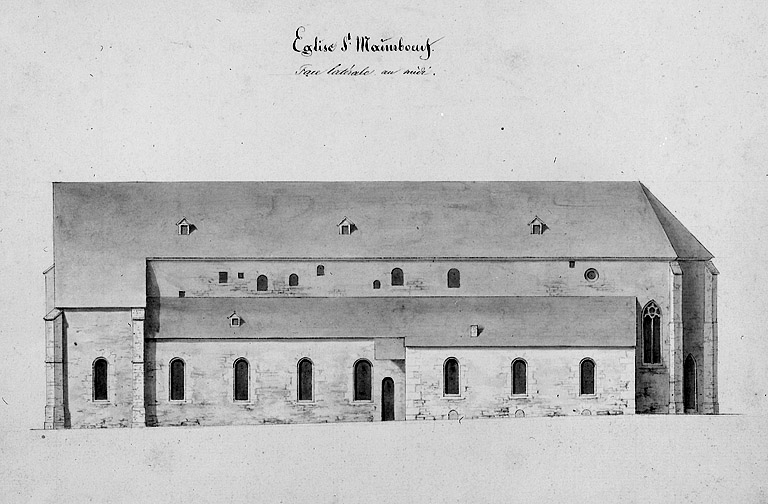Date de fondation de l'église primitive dédiée à saint Pierre inconnue ; passa sous le vocable de Saint-Maimboeuf à la fin du 9e siècle ou au début du 10e siècle lors du transfert des restes de ce Saint dans cet édifice ; 1135 le comte Thierry II y fonde un chapitre d'augustins ; travaux de reconstruction en 1080, puis dans la 1ère moitié du 12e siècle et consacrée en 1149 (subsistaient au début du 19e siècle les murs gouttereaux de la nef charpentée) ; 14e siècle, nef voûtée d'ogives et choeur reconstruit sur crypte ; 15e siècle, réédification de la 1ère travée de la nef, de la façade et au moins de la partie haute du clocher ; 1538 passe au culte luthérien (appelée dès lors église allemande) ; en 1563 établissement d'une couverture en cuivre sur le clocher ; 1628 écroulement du clocher qui ne sera jamais reconstruit malgré des projets par Jean flamand en 1628 et d'autres en 1753, 1754, 1759 et 1764, 1765 ; pillée en 1793 et totalement détruite en 1808 ; ensemble de chapiteaux récemment retrouvés et déposés au musée du château