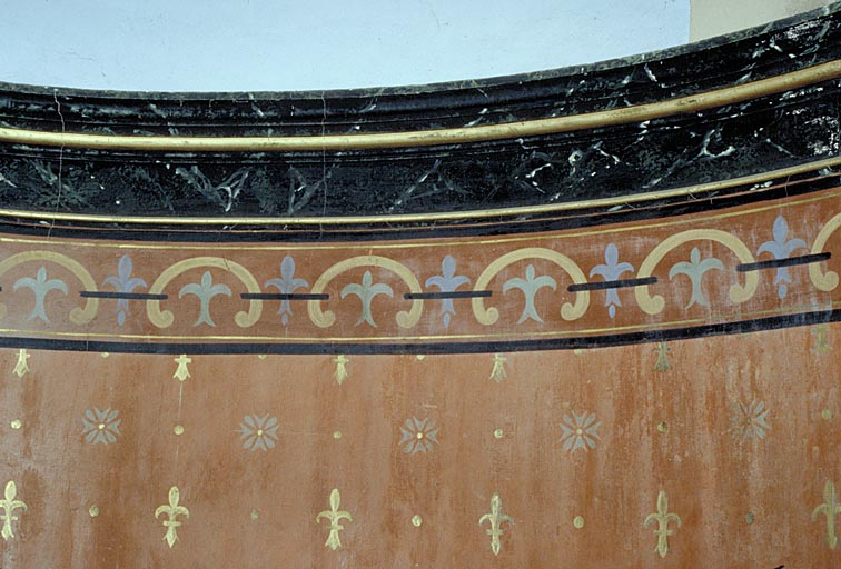 sujet : croix latine, support : clocher mur ; sujet : croix de Malte, fleur de lys, support : peint sur les murs du choeur
