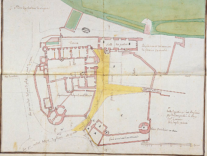 Un castrum, sans doute en bois, fut construit vraisemblablement au 10e siècle. Vers le milieu du 12e siècle est élevée une forteresse en pierre dont subsistent des vestiges dans les sous-sols voûtés. Au 13e siècle, les Lusignan font construire un logis voûté d'ogives au sud-ouest, une chapelle, qui est peut-être la chapelle Notre-Dame, et les tours nord-est et sud-est. Il reste de cette période des arcs formerets dans le corps de logis sud-ouest. Sous les Valois furent entrepris d'importants travaux : un logis, dit aujourd'hui logis du Gouverneur, fut construit pour Jean de Valois au milieu du 15e siècle, des salles furent aménagées ainsi que la tour sud-ouest, et des cheminées dont la grande cheminée à blason de la salle dite des Casques. Charles, fils de Jean de Valois, et sa femme, Louise de Savoie continuèrent les travaux à la fin du 15e siècle et firent construire la chapelle Saint-Caprais. Au début du 16e siècle, les travaux se poursuivent pour François Ier avec la destruction des anciennes murailles qui entouraient le château, la construction du grand bâtiment ouest, comprenant la salle des gardes, qui se terminait autrefois en terrasse, et celle d'une galerie au sud et d'appartements à l'est. La chapelle reçoit des aménagements. Au 18e siècle, plusieurs bâtiments sont détruits, le château est vendu comme bien national et, en 1795, une maison de commerce d'eau-de-vie s'y installe et effectue de nouvelles constructions. En 1812, la tour nord-est détruite. En 1852, la chapelle, dont il ne reste que des vestiges, l'est à son tour. De vastes magasins à eau-de-vie sont alors construits et, à cette même époque, le long corps de bâtiment ouest est surélevé. Dans la salle dite des gardes se trouvent des graffiti avec les dates 1750, 1757. De nombreuses sculptures ont été détruites ou déplacées