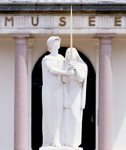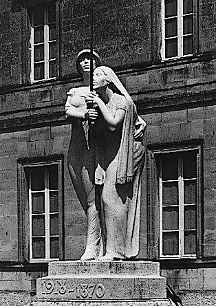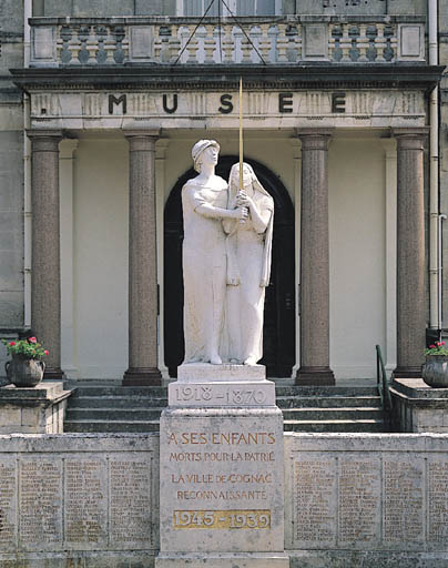 Monument aux morts de la guerre 1914, 1918 édifié en 1921 et 1922 sous la direction de l'architecte parisien Victor Auguste Blavette ; le groupe a été sculpté par le sculpteur parisien Albert Bartholomé, signature : breton Cie la Rochefoucauld Charente, A. Bartholomé