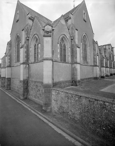 1ère église de plan allongé à deux vaisseaux, couverte en lambris ; bras sud du transept couvert en lambris ; échauguette, couverte d'un toit conique ; 2e église à trois vaisseaux voûtée d'ogives ; clocher couvert d'une flèche polygonale