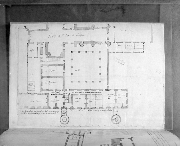 église ; cloître ; enclos ; salle capitulaire ; hôtellerie ; crypte ; cimetière ; jardin régulier ; logement ; atelier ; lavabo de cloître