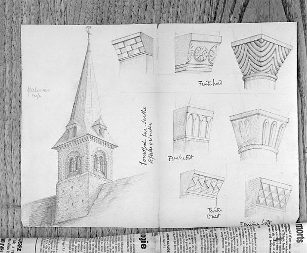 sujet : cercle, arcs de cercle concentriques, damier, dents de scie, support : chapiteaux du clocher ; sujet : croix, support : pignon occidental