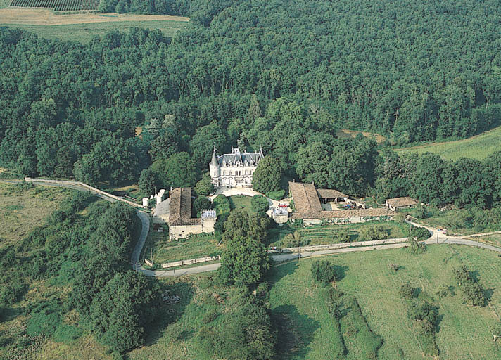 Château en pierre de taille et couvert d'ardoise ; bâtiments de ferme et communs en moellon et tuile creuse