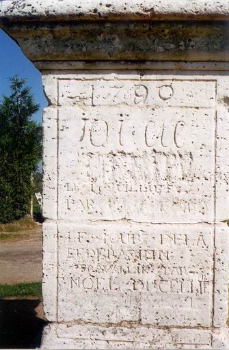Croix de chemin exécutée par Noël Ducellier et érigée le 14 juillet 1790, le jour de la fête de la fédération ; une croix en ferronnerie a été posée sur le socle au 20e siècle