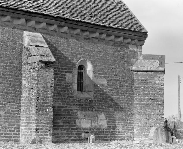Choeur du 13e siècle ; nef et chapelle seigneuriale de la fin du 15e ou du début du 16e siècle, blason de la famille de Courcelles seigneur du lieu dans la chapelle ; édifice remanié dans la 1ère moitié 19e siècle : percement d'une fenêtre dans le choeur, modification du portail antérieur, réfection du mobilier