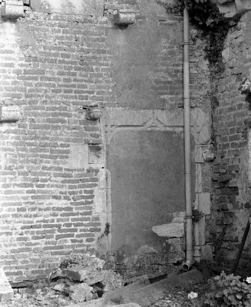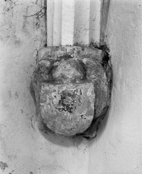 armes de la famille de Courcelles entourées d'une couronne tressée, support : clé de voûte de la chapelle seigneuriale ; sujet : anges porte écu, support : culots de la chapelle seigneuriale et console de la nef ; sujet : feuillage et devise, support : carreaux de terre cuite vernissée de la chapelle seigneuriale