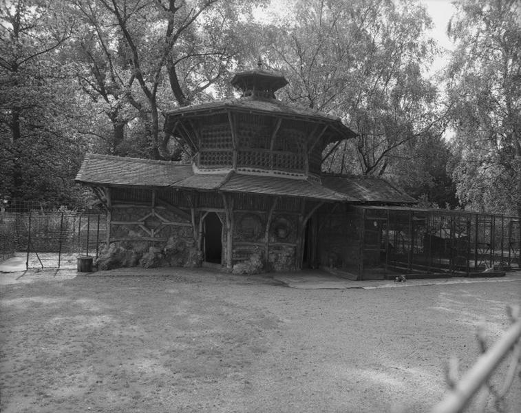 Serre à façade de pierre ordonnancée ; pavillon abritant les volières décoré de bois sculpté à l'extérieur ; pavillon des daims à toit polygonal