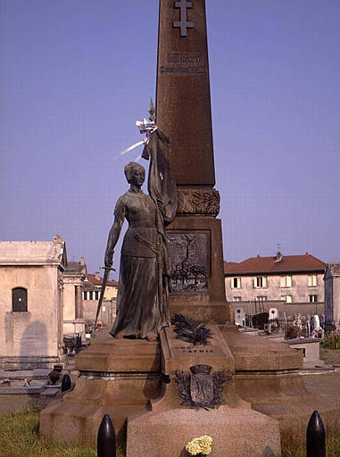 Monument aux défenseurs des trois sièges de Longwy (1792, 1815, 1870) érigé sur des plans de Paul charbonnier, architecte à Nancy, avec un bronze d'Ernest Bussière, sculpteur à Nancy, inauguré en 1912 par Albert Lebrun et Raymond Poincaré, daté par source