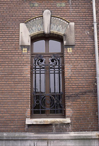 support : fronton ; support : entablement de la porte rue des soeurs blanches ; sujet : décor en céramique polychrome, support : frise sous corniche, arcs de fenêtres
