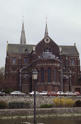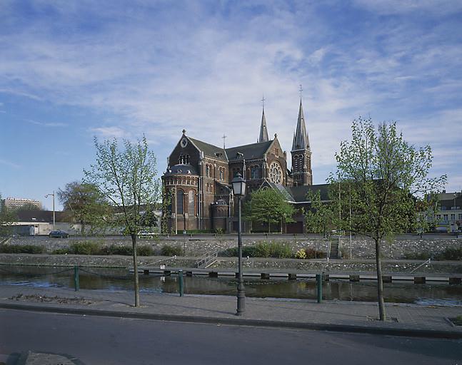 Fondations en béton, gros oeuvre en brique, pierre pour le soubassement, les piliers, les colonnettes, les gâbles, les appuis, les cordons, les corniches, enduit imitant la pierre de taille pour les élévations intérieures, fausse voûte en berceau segmentaire sur la nef, fausse voûte d'ogives à la croisée en lambris, fausses voûtes en cul-de-four sur l'abside et les absidioles de transept, coupole de brique enduite sur les bas côtés, voûte d'arête sur le porche ; salle de catéchisme couverte par une fausse voûte en berceau segmentaire lambrissé