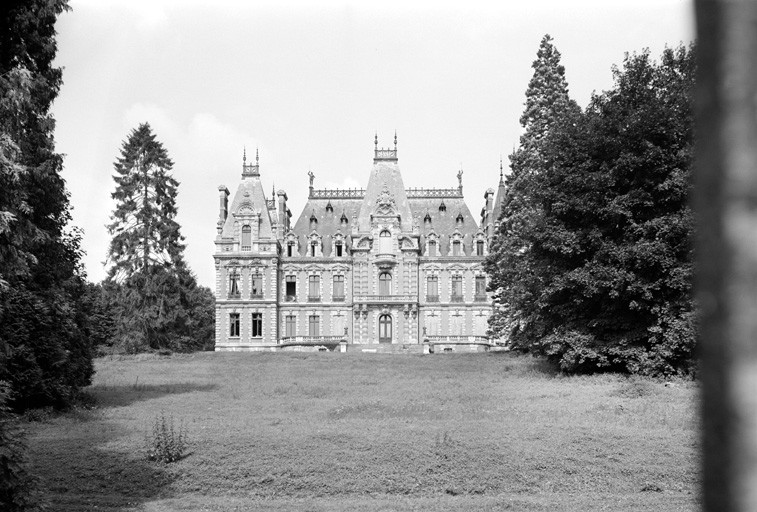Façade et toiture du château ; grille d'honneur ; grand escalier de pierre à balustres avec son plafond peint ; pièces suivantes avec leur décor : hall d'entrée, grand et petit salons, grande et petite salle à manger, salle de billard, chambre, bureau, cuisine au rez-de-chaussée ; salle de bains, chambre de Missié, chambre d'angle, salle de bains adjacente au premier étage ; façade et toiture des écuries (avec leur mur à balustres) et du château d'eau ; mur de soutènement à balustres clôturant le parc le long de la R.D. 12 (parcelles AC 45-47, 49) : inscrit par arrêté du 28 avril 1980.