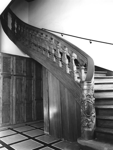 escalier de distribution : escalier symétrique, en maçonnerie ; escalier intérieur : escalier tournant, en charpente