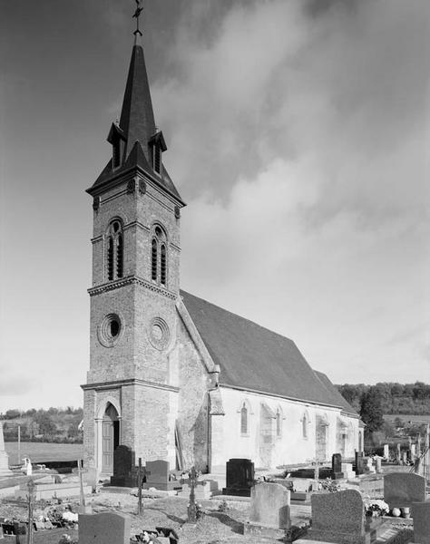 Clocher en brique, couvert d'une flèche polygonale ; nef et choeur en pierre enduite, couverts d'un toit à longs pans ; sacristie en brique, couverte d'un toit en croupe polygonale