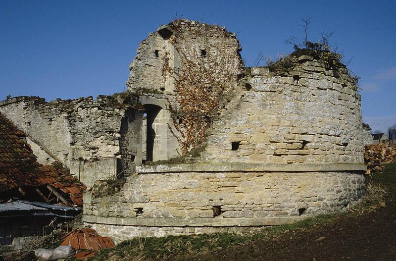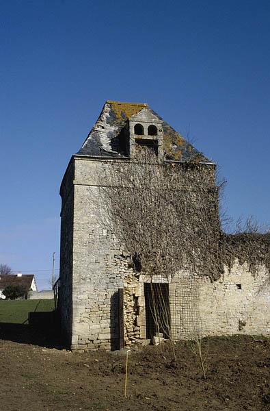 Logis : aile nord à 2 étages, 1 travée construite, aile est seulement amorcée, à 1 étage, peut-être destinée à être couverte en terrasse, tour sur l'angle nord-est comprenant des départs de voûtes de forme indéterminable, voûte en berceau plein-cintre dans le couloir au rez-de-chaussée de l'aile est, moellon enduit, toit à croupe sur l'aile nord ; corps des galeries : ouvert au rez-de-chaussée, fermé à l'étage, pierre de taille pour le 1er niveau, moellon enduit pour le 2e, escalier dans-oeuvre en pierre, tournant à retours sans jour, les contreforts, la tourelle et le mur pignon est ont été ajoutés après coup ; ferme : moellon, ardoise et tôle ondulée en couverture, pignon découvert, logement d'1 étage en moellon enduit ; colombier : moellon, toit en pavillon
