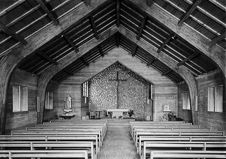 Eglise moderne aux murs en béton coffré ; le couvrement en lamelle collé est apparent ; la couverture est en ardoise et recouvre le toit à deux pans et le auvent situé sur le devant de l'église ; le mur du fond du choeur reçoit un parement de pierres apparentes, tout comme l'extérieure de la chapelle baptismale ; le clocher en moellon enduit reçoit quant à lui une flèche polygonale à égout retroussé de plan carré et recouvert également d'ardoises