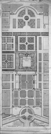 cour ; basse-cour ; jeu de paume ; chapelle ; grotte artificielle ; douves ; parc