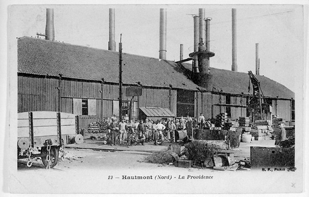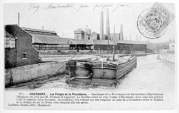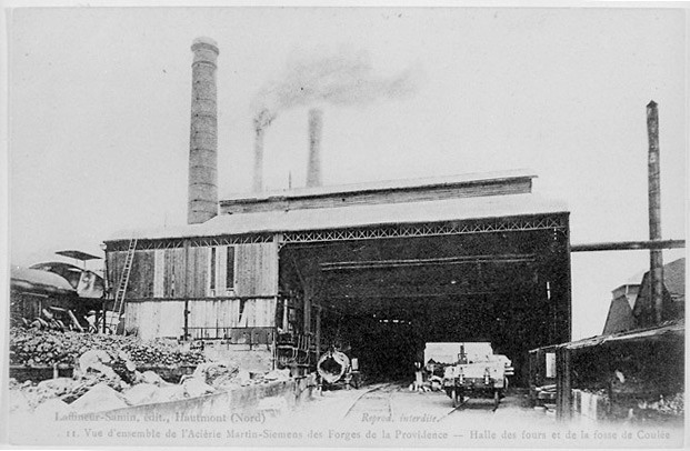 Ensemble métallurgique composée d'une aciérie, de laminoirs, d'un bureau construits vers 1920 et d'un laboratoire construit en 1965. Ensemble métallurgique fondé en 1832 par M. Puissant d'Agimont avec des capitaux belges. Celle-ci ne comprend alors que des laminoirs situés à Marchiennes (Belgique) au lieu-dit La Providence. L'assemblée générale du 12 juin 1843 prend la décision de créer une nouvelle usine à Hautmont, sur la Sambre et le tracé probable d'une ligne de chemin de fer. Celle-ci sera équipée de laminoirs à tôles, à barres marchandes et surtout à rails bientôt nécessaires pour le réseau ferroviaire français. De plus, outre des considérations douanières, Hautmont est proche des charbonnages du Borinage et des mines de fer de l'Avesnois et est relié à Charleroi par la Sambre. L'usine d'Hautmont prend rapidement de l'ampleur fournissant des tôles de marines au gouvernement français et des rails aux compagnies de chemins de fer. Entre-temps, une usine est construite à Réhon (Belgique) et en 1898 à Marioupol en Russie sous le nom de S.A. Providence Russe. A Hautmont, l'usine qui avait été complètement modernisée de 1904 à 1914 est entièrement détruite lors de la Première Guerre mondiale. On construit l'aciérie Martin Siemens et on réinstalle un train à tôles récupéré en Allemagne. En 1921, l'usine s'étend sur la rive droite de la Sambre où sont construits de nouveaux trains de laminoirs. Souffrant peu de la Seconde Guerre mondiale, la société se modernise. En 1966, elle devient la société Cockerill Ougree Providence, puis Cockerill Sambre. Fermeture de l'usine en 1985.£La S.A. de La Providence installe en 1843 à Hautmont des laminoirs et une fonderie. Erection d'un premier haut fourneau et de 40 fours à coke en 1845. Agrandissement en 1847. Construction d'un deuxième haut fourneau en 1853 puis d'un troisième en 1855. Nouvel agrandissement en 1866. Constructions de 50 fours à coke en 1873. Construction de 4 fours Martin vers 1890. En 1895, l'usine d'Hautmont produit 60000 t de fers marchand, tôles et 6000 tonnes de pièces moulées en fonte. Construction d'un atelier de galvanisation en 1904. Etablissement d'une tôlerie moderne et de 3 fours Martin en 1949. Installation d'un nouveau Blooming en 1958. Construction d'un laboratoire en 1966. En 1970, la production est de 165000 t d'aciers spéciaux, les installations s'étendent sur une superficie de 55 ha dont 9 couverts. Mise en activité d'une aciérie électrique en 1978.£La providence d'Hautmont occupe jusqu'à 2500 ouvriers bénéficiant de logements, d'une caisse de secours. Elle en compte encore 1700 en 1970. Voir dossiers individuels aciérie, laminoir, bureau, laboratoire des forges et fonderies de La Providence