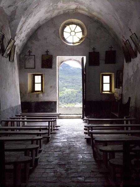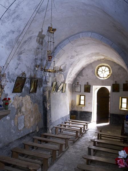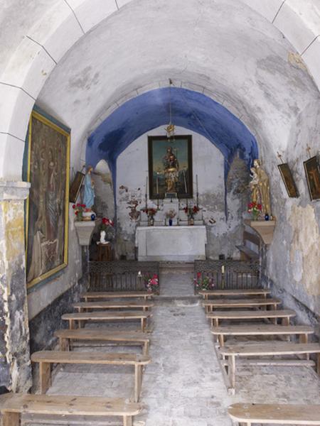 Située à l'est du village, au bord de la Grand Rue, la chapelle s'inscrit dans l'alignement du tracée de la rue. L'édifice présente un plan allongé à chevet plat. Il comprend une nef et une abside voûtées en berceau. Un arc doubleau délimite les deux travées de la nef. Deux arcs formerets en plein cintre sont intégrés dans les murs est et ouest du choeur (créant ainsi un léger élargissement de cet espace). L'édifice est couvert d'un toit à longs pans en tuiles plates souligné par un à deux rangs de génoise maçonnée. Les élévations extérieures présentent un enduit récent. La façade en pignon se compose d'une porte surmontée d'un arc en plein cintre en tuf, de deux ouvertures de part et d'autre de la porte et d'un oculus. Un clocher-mur, en tuf apparent, comprend une baie en plein cintre coiffée d'un toit à deux pans en tuiles creuses sommé d'une croix en fer forgé.