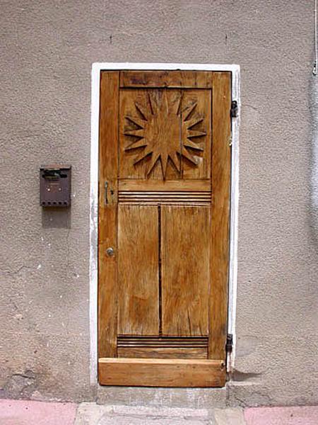 Soleil en bois découpé en applique sur le vantail de la porte.