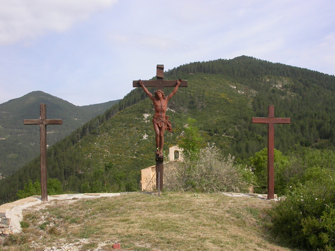 Sur le site de l'ancien bourg castral au dessus du village, le calvaire a été érigé devant la chapelle Saint-Jean-Baptiste et les oratoires jalonnent le chemin qui y monte. Le calvaire consiste en trois croix monumentales (hauteur 250 et 330) en bois de section carrée plantées sur une plate-forme soutenue par un muret en blocage. La plus grande des croix, au centre, porte un Christ en fonte. Il ne reste que 4 des 14 oratoires édifiés à l'origine pour les stations du chemin de croix. Tous sont des piliers de 60 à 65 cm de côté et environ 200 cm de hauteur, construits en blocage de moellons bruts enduit au mortier de chaux, avec une niche en plein-cintre à encadrement saillant avec clef passante en tuf. Les trois premiers ont aujourd'hui un couvrement en bâtière surmonté d'une croix en fer forgé à branches en coeur. Le dernier, devant la chapelle, a gardé son couvrement pyramidal en pierre de taille d'origine.