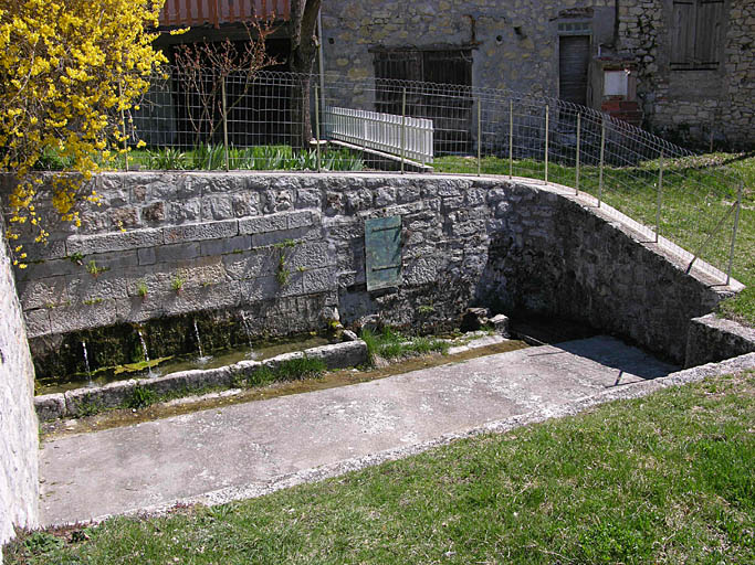 Cet abreuvoir encaissé est adossé à la pente. L'accès se fait pas un grand escalier de quatre marches en pierre de taille calcaire, utilisable par les troupeaux. Le grand bassin est construit en pierres de tailles calcaires sur chant, agrafée. Il est alimenté par quatre canons fait de tubes métalliques simples. Le grand bassin est prolongé par un bassin plus petit, construit selon le même procédé.