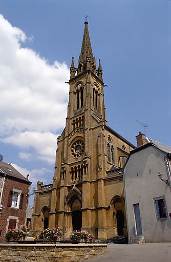 Eglise de style néogothique. L'édifice présente un plan en croix latine, un clocher-porche et un transept saillant. La nef se compose de six travées, d'un vaisseau central et d'un collatéral. L'édifice est appareillé en pierre de Dom. Le toit, à longs pans, avec une croupe au niveau du choeur, est réalisé en ardoise. La sacristie, présentant le même appareillage de calcaire, est construite entre le bras droit du transept et le choeur.